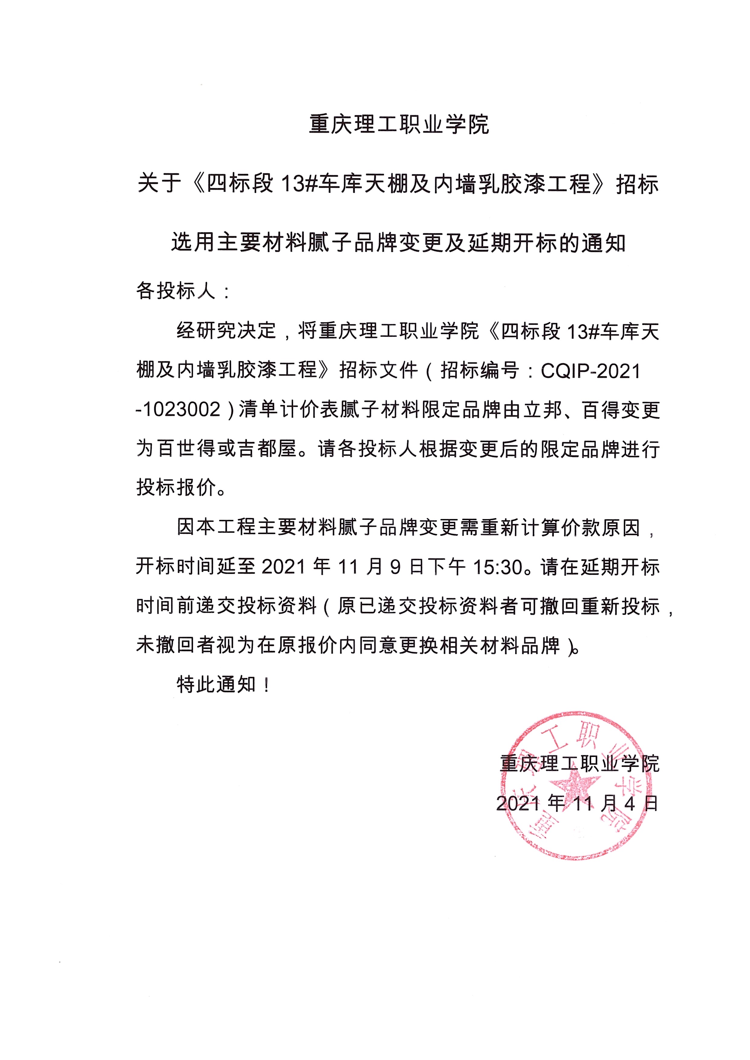 学院四标段车库乳胶漆品牌变更及延期开标通知