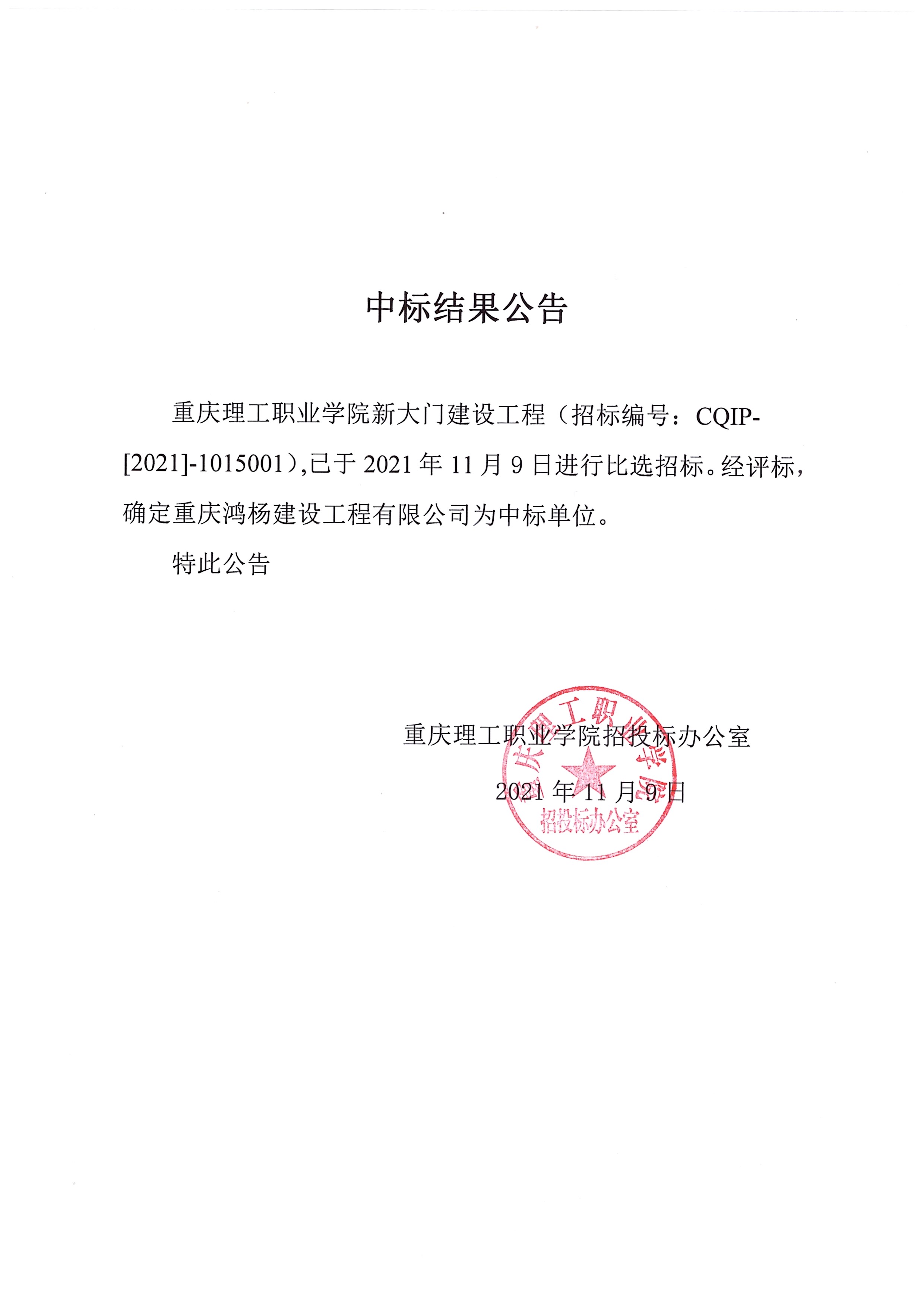 学院新大门建设工程中标结果公告