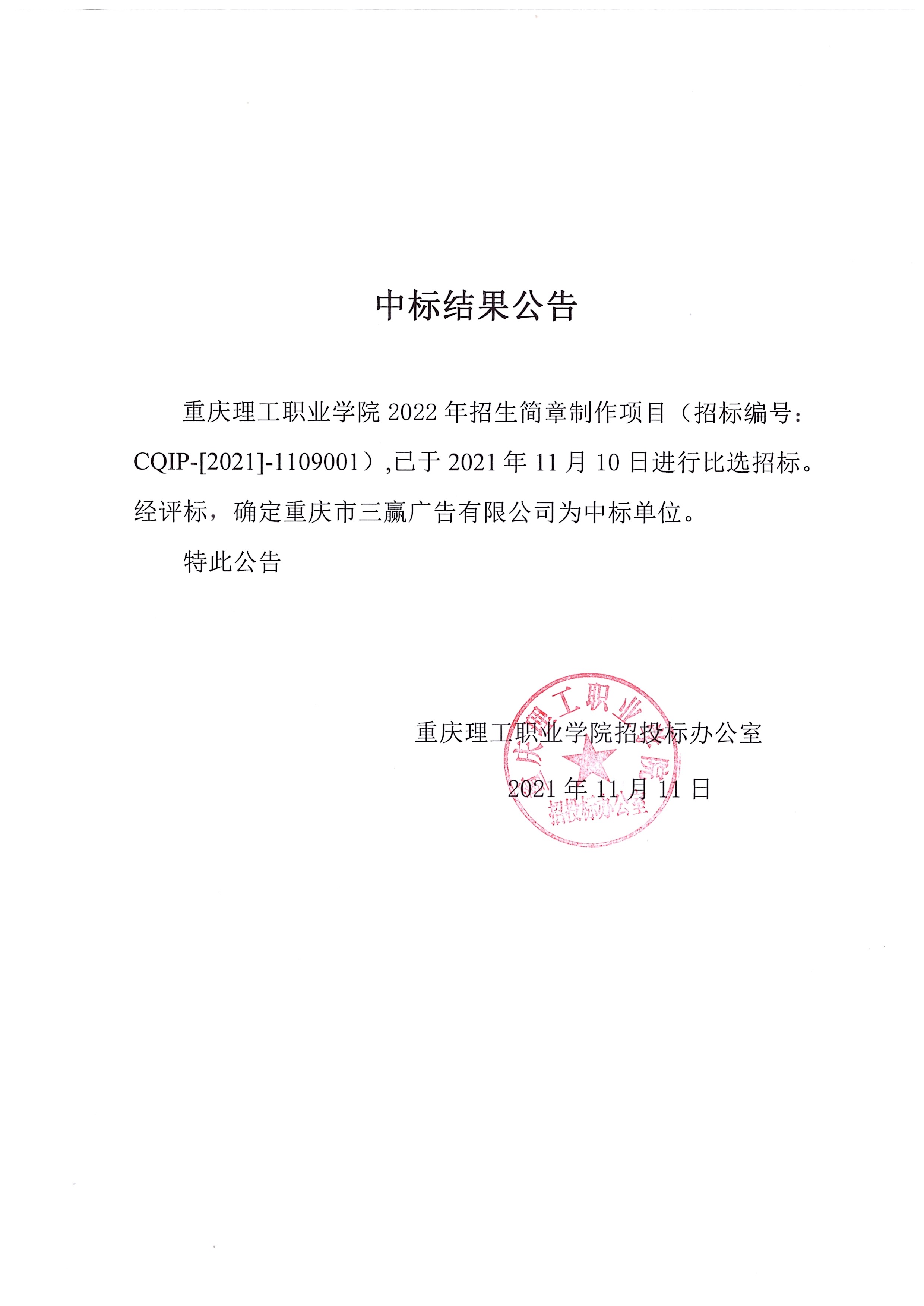 学院2022年招生简章制作中标结果公告