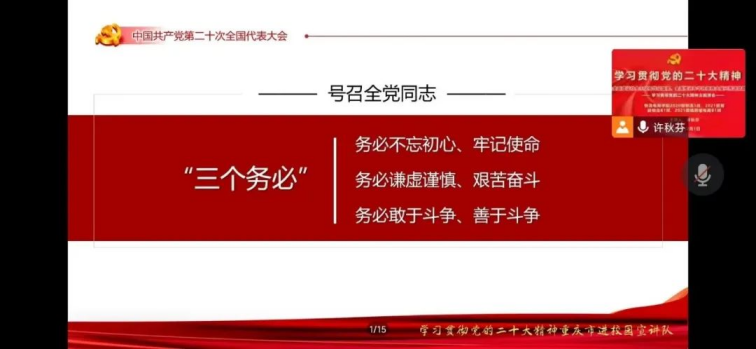 12月2日,应急管理学院在线上召开学习党的二十大精神主题宣讲会,辅导员安宁老师进行宣讲。在宣讲过程中以理论结合实际,用通俗易懂的方式,讲解了二十大相关理论思想,让我们明白学习宣传贯彻党的二十大精神是当前和今后一个时期全党全国的首要政治任务。要以强烈的政治责任感迅速在全院掀起学习宣传贯彻党的二十大精神的热潮。