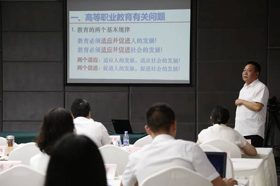 王忠副教授以《高等职业教育课程教学要求》为题,从高职院校与普通高校的学生区别、高职专科课程体系的基本特点、高等职业教育教学模式与教学方法等高等职业教育有关问题入手,讲解了高职教学工作基本要求、高职院校课堂教学要求,并进行了案例研讨交流。