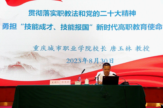 “国培”“市培”和“评估监测”“规划起草”专家,具有国家“示范校”、国家“优质校”、国家“双高校”申报创建经历,国家级教学成果一二等奖获得者,现任重庆城市职业学院校长唐玉林教授,以《贯彻落实职教法和党的二十大精神,勇担“技能成才、技能报国”新时代高职教育使命》为题,从党的指引:党的二十大“1+3+3”的职教论述;国家使命:新《职业教育法》条文概要精神解读;职教认知:我们从事的是一种什么样的教育工作;课程专业:“技能成才、技能报国”的根本依托4个方面,系统解读了新《职业教育法》,为参训教师如何建好课程专业、当好职教人传递了“真经”。