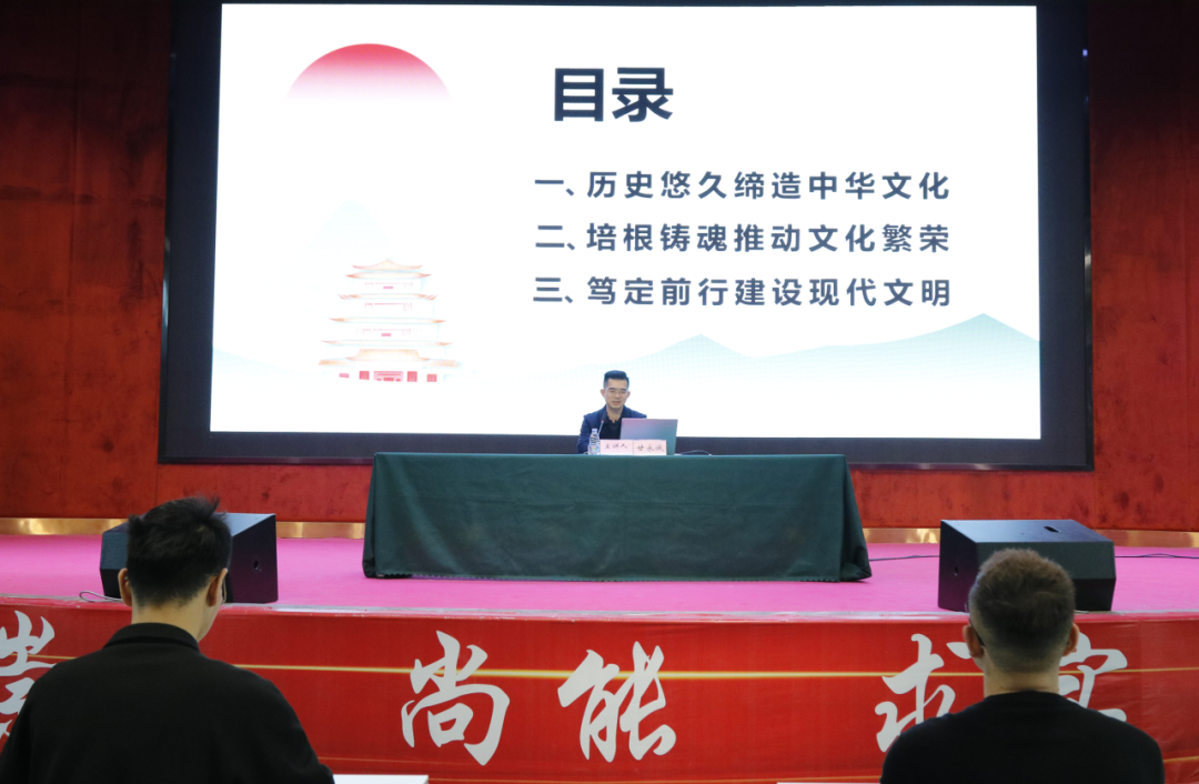 甘永诚副校长以夏、商、周等封建王朝的更替为切入点,从历史悠久缔造中华文化、培根铸魂推动文化繁荣、笃定前行建设现代文明等三个角度讲述了几千年来,中华民族能够历尽磨难而薪火不辍、屡经世变而固本开新的根本,这就在于中华文明源远流长、一脉相承,塑造了我们这个伟大的民族。通过分析中国古往今来的变革,从而更能深刻认识到,实现中华民族伟大复兴是近代以来中国人民的共同梦想。