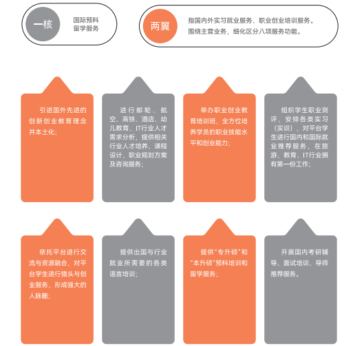 为促进国内外就业和学历提升提供优质渠道,企业发展愿景围绕“一核两翼”战略布局,打造集国际预科与留学服务、国内外实习就业服务、职业创业培训服务于一体的综合型服务平台、业界领军企业,成为特色突出、具有高知名度和影响力的国内一流商学园。