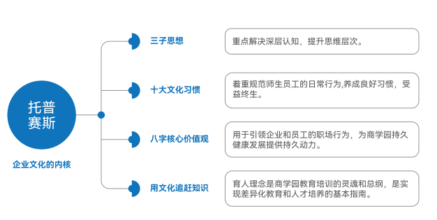 “托普赛斯”就是企业文化的内核,由此延伸开来,我们构建了“四位一体”的企业文化体系,即“三子思想”、“十大文化习惯”、“八字核心价值观”、“用文化追赶知识”育人理念。四者围绕统一的文化内核,在不同层面发挥作用。其中,“三子思想”重点解决深层认知,提升思维层次;“用文化追赶知识”育人理念是商学园教育培训的灵魂和总纲,是实现差异化教育和人才培养的基本指南,是托普赛斯商学园在多年办学实践中,基于知识水平整体不高的生源基础,采取与普通高校不同的差异化办学模式,在教授学生文化知识、专业技能的同时,聚焦学生精神特质、文化习惯养成和创新创业能力培养,每年开展职业测评,加强职业引导,为他们铺就一条契合自身条件的学业和职业发展之路。