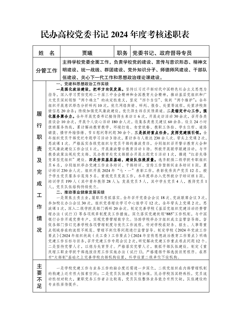 民办高校党委书记2024年度考核述职表