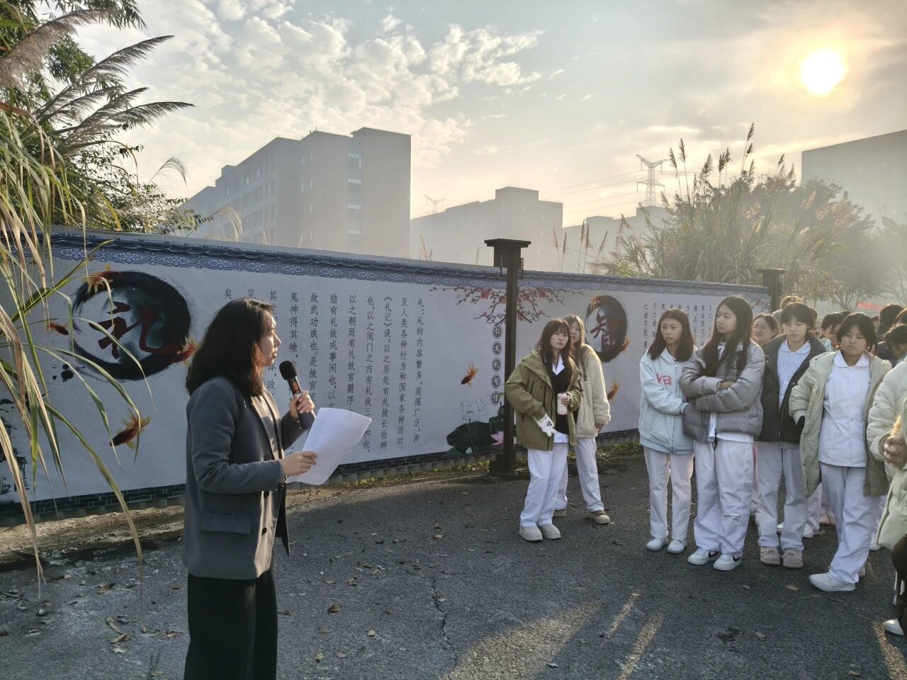 第二站,队伍抵达校园文化墙——学校倾力打造的“文化育人”开放式平台。同学们驻足中华优秀传统文化板块,从“仁义礼智信”的道德精髓到诗词书画、古代科技、传统民俗,图文并茂的展示让大家深切感受中华文化的博大精深。文永春适时引导未来医护工作者,从传统文化中汲取养分,涵养职业道德、提升人文素养。