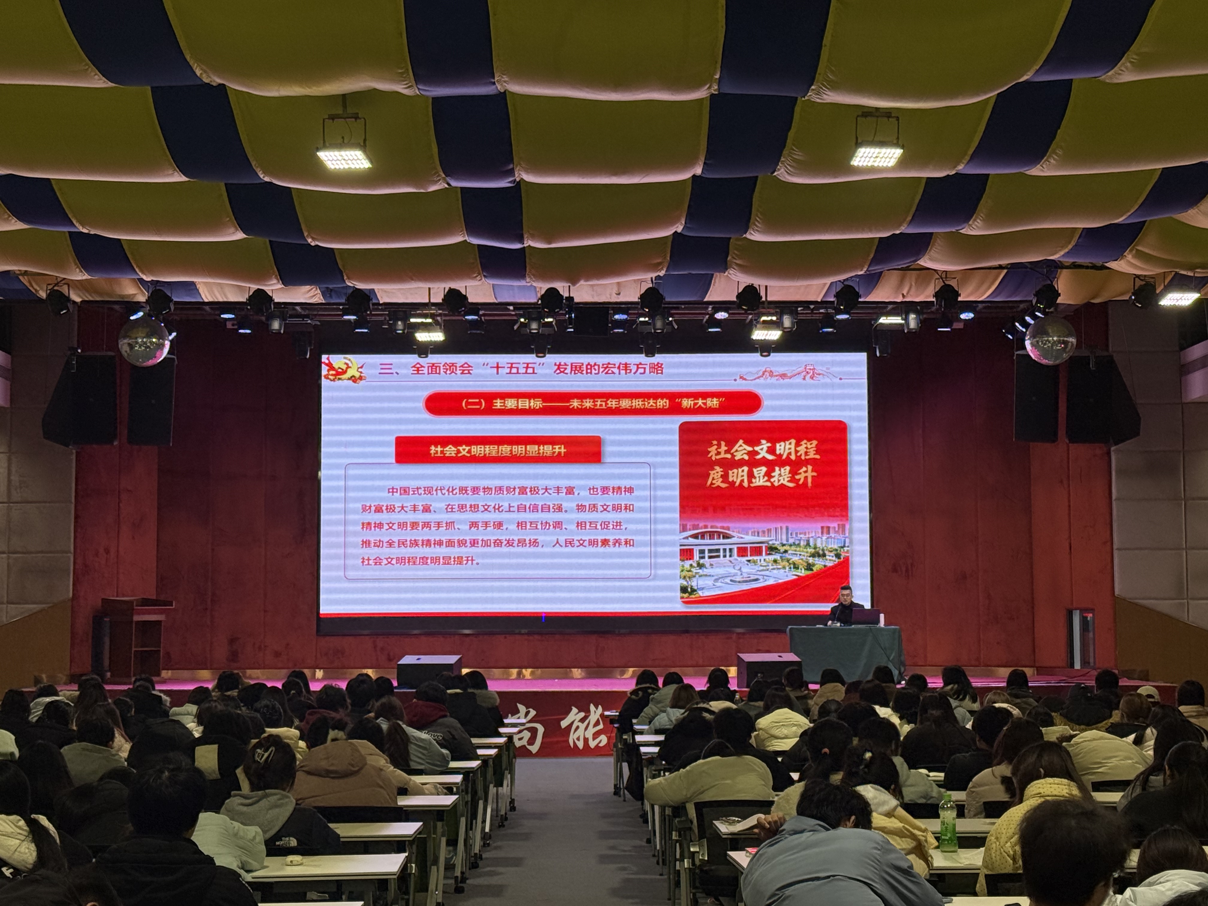 甘永诚围绕党的二十届四中全会精神,从四个维度展开系统讲解,内容翔实、内涵深刻。一是深刻领会“十四五”时期的辉煌成就。引导学生干部站在中华民族伟大复兴战略全局的高度,认识全会的历史方位与决策分量。二是准确把握党中央对发展形势的科学判断。重点围绕国家治理、高质量发展、教育强国、新质生产力等关键议题,梳理脉络、解析内涵。三是全面领会“十五五”发展的宏伟方略。鼓励学生干部勇当先锋、争做表率,以专业所长对接产业所需,以实干担当架起校企协同的桥梁。四是切实推动全会精神落地生根。鼓励学生干部将个人成长融入国家发展,在“学深悟透、对标对表、真抓实干”中锤炼本领,成为有理想、敢担当、能吃苦、肯奋斗的新时代好青年。