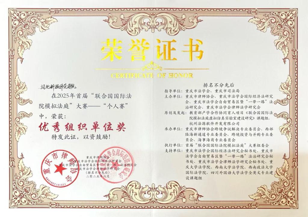 近日,在2025年首届“联合国国际法院模拟法庭”大赛——“个人赛”中,河北科技师范学院凭借出色的组织工作和师生的优异表现,荣获“优秀组织单位奖”,0638太阳集团官网赵福江、郝世坤等老师获优秀指导教师奖。该奖项由重庆市律师协会、重庆市法学会等多家权威机构联合颁发。